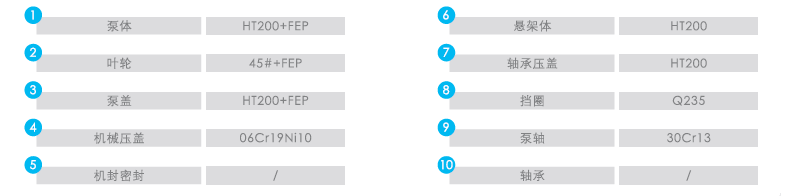 泵体采用高强度灰铸铁内衬氟塑料整体模压一次成型工艺,泵盖、叶轮等过流部件采用金属嵌件外衬氟塑料整体模压一次成型工艺,塑层厚度留有足够的腐蚀余量,衬塑面与金属件贴合紧密,内流道光滑匀称无缺陷。