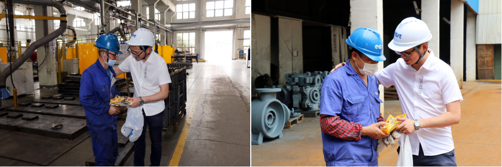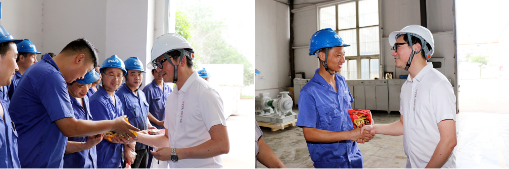 6月13日,端午节期间,东方泵业生产车间现场依旧热火朝天地进行作业。集团董事长助理吴俊力等高层领导组成的慰问小组,深入公司一线,为节日期间依然奋战在一线、坚守在岗位上的职工送去了飘香的粽子,同时向职工家属给予的理解与支持表示最诚挚的感谢!